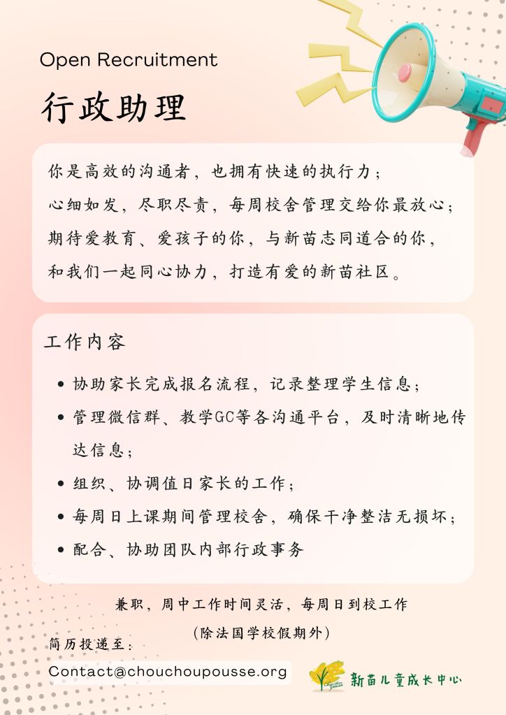 兼职,根据法国校历,每周日上午线下小班课程,可能与周中线上课相结合,也有可能参与到其它项目中。