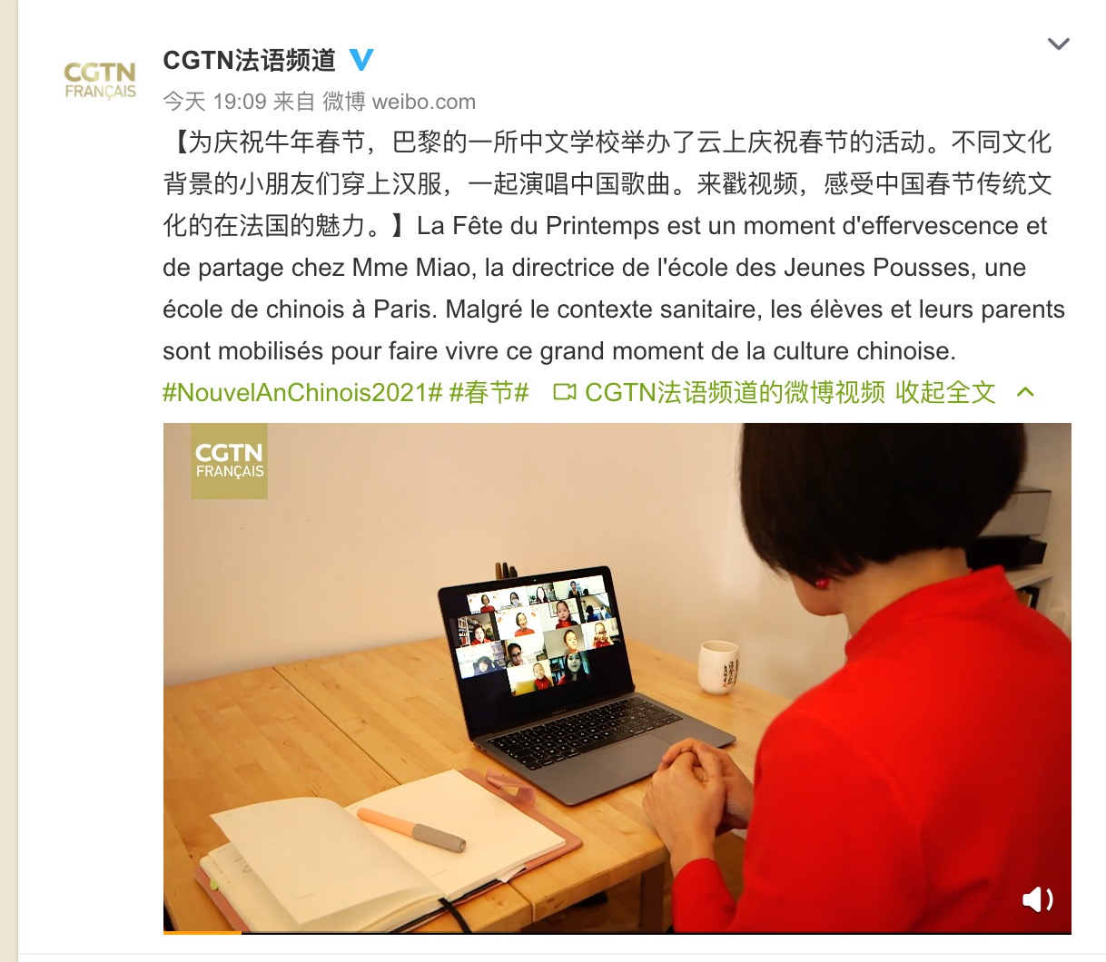 - CGTN 中国环球电视网法语频道 Fête du Printemps : École des Jeunes Pousses à Paris, 12/02/2021